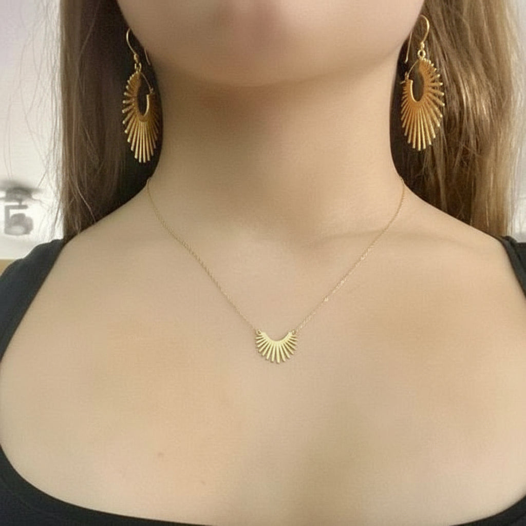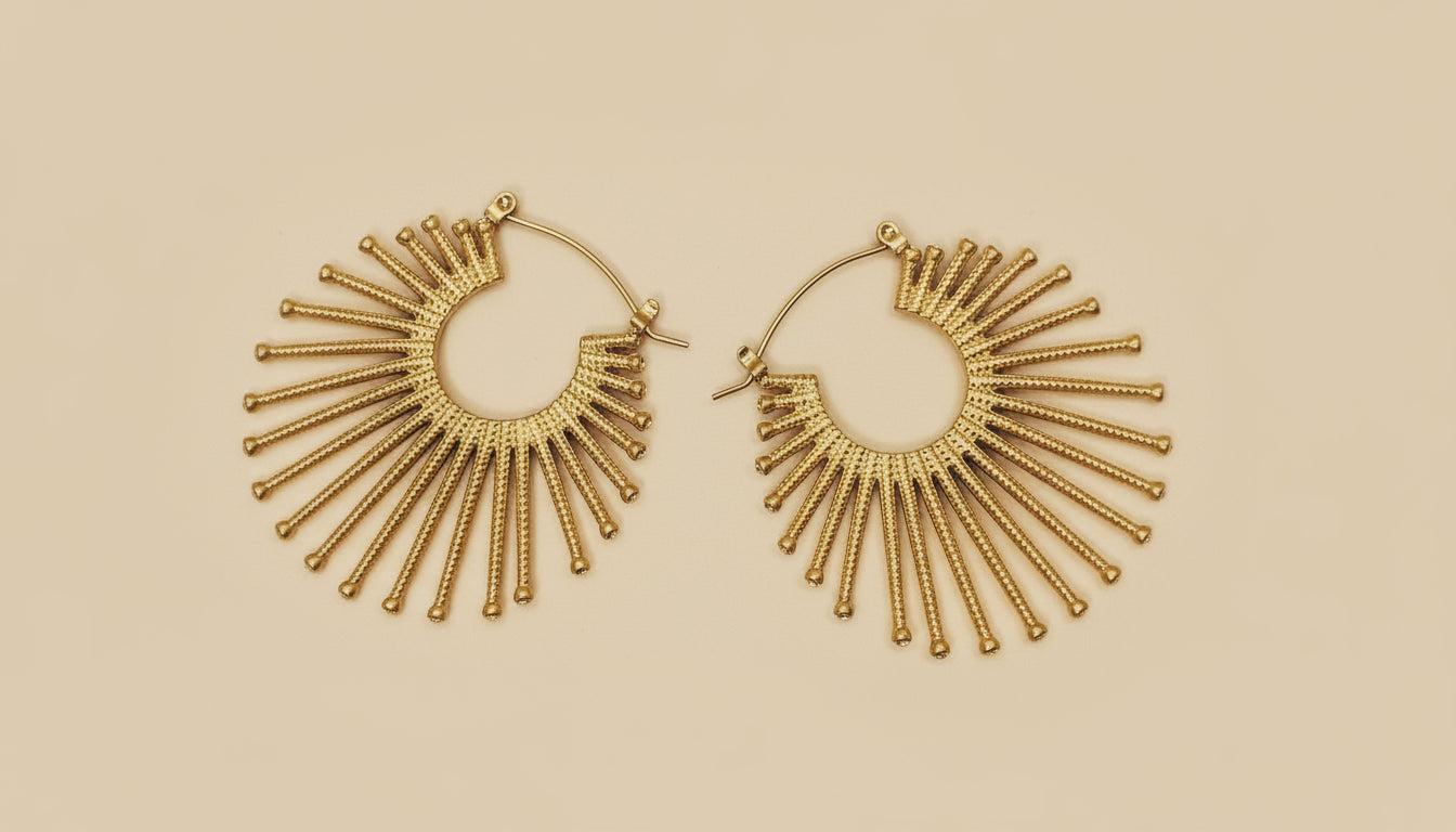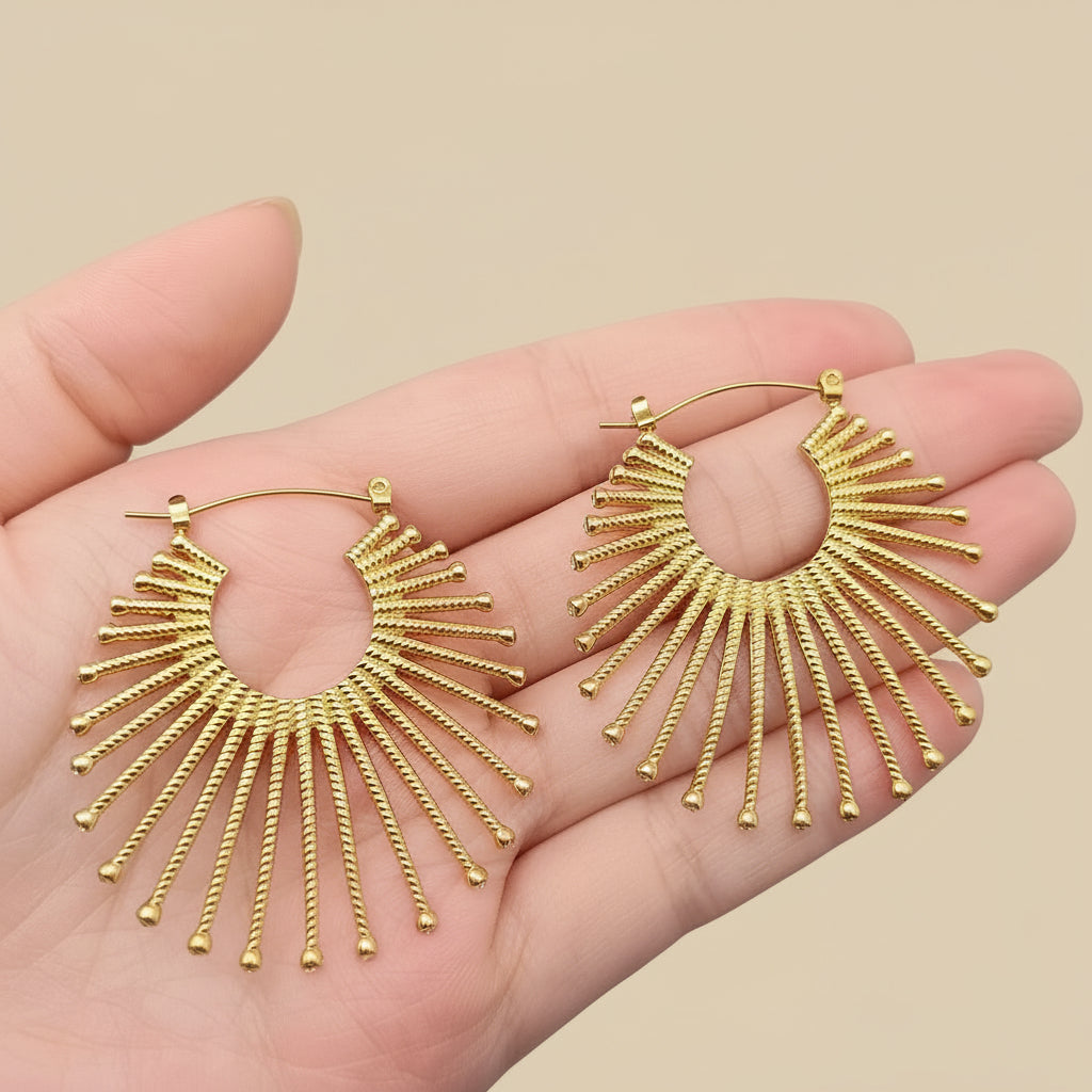 Rayons dorés, éclats de lumière, boucles d'oreilles soleil en acier inoxydable, zircone cubique.