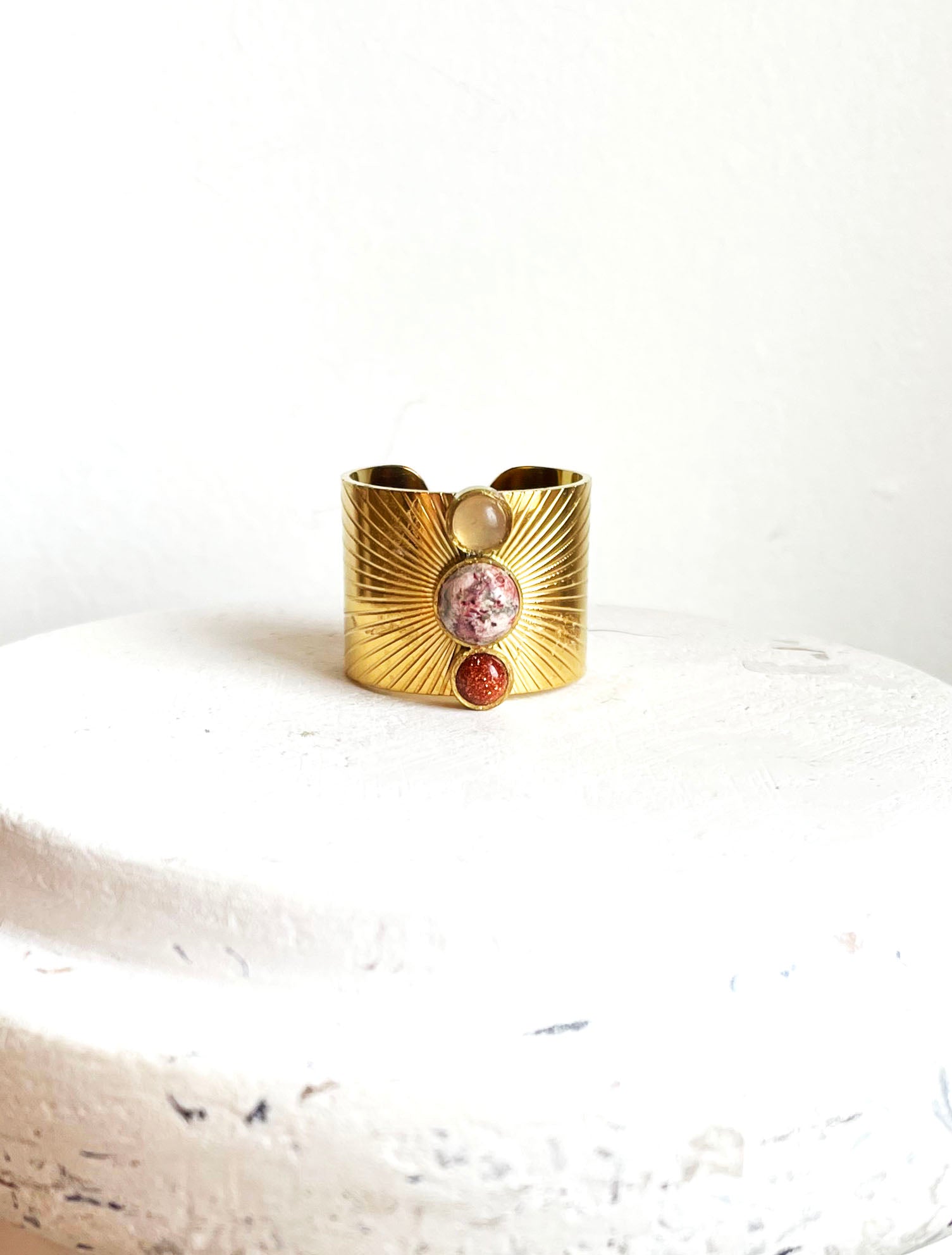 Cette bague ornée en quartz rose apporte une touche de tendresse, la pierre du soleil capte la lumière avec subtilité, et la jaspe léopard ajoute une note organique et chaleureuse. Une création pensée pour sublimer le quotidien comme les occasions particulières.